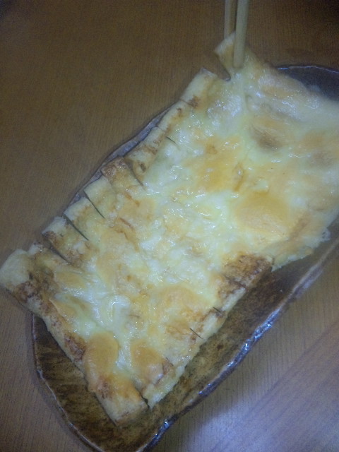 油揚げのチーズ乗せ。 1、5センチ位の幅に切った揚げに桔梗屋の豆腐専用醤油をピロッてかけて、チーズを乗せてトーストするのだ。