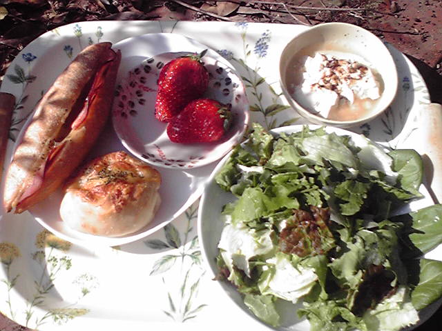 コピンヌさんのパン、採れたて野菜のサラダ、できたてレンジ豆腐、これには「赤糖」をかけて、デザートに。そして、昨日子供が送ってきてくれたイチゴ。