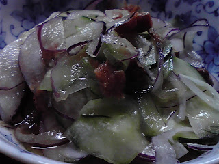 赤い新玉ねぎ、きゅうりに鯖のへしこをほぐして加えオリーブオイルをたらして、桔梗屋のオリジナル醤油をかけた。家族の反応は良いみたいだ。今日はどうしても、こうして食べてみたかった。