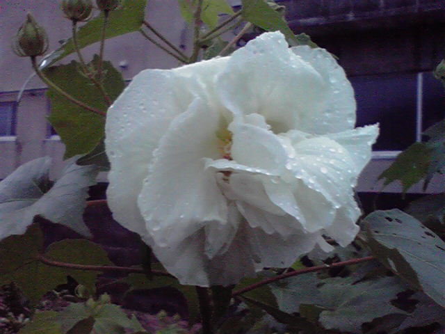 雨が降るなか、二つ目が咲いた。昨日のはお酒に酔ってあかくなりましたー。て感じです。色が濃くなって、一日で終わり。