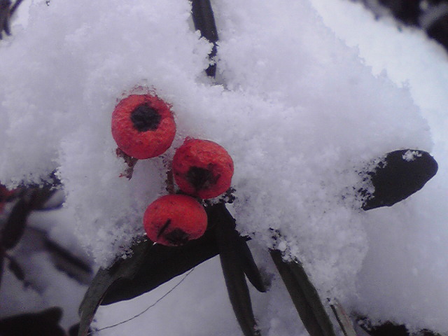 あけましておめでとうございます今年も(一方的に)よろしくお願いします雪の白と実の赤のコントラストがいいですねナナカマド?と思って調べたら似たような感じですが別ものでした花言葉は「慈悲」・・・・ほほぅ